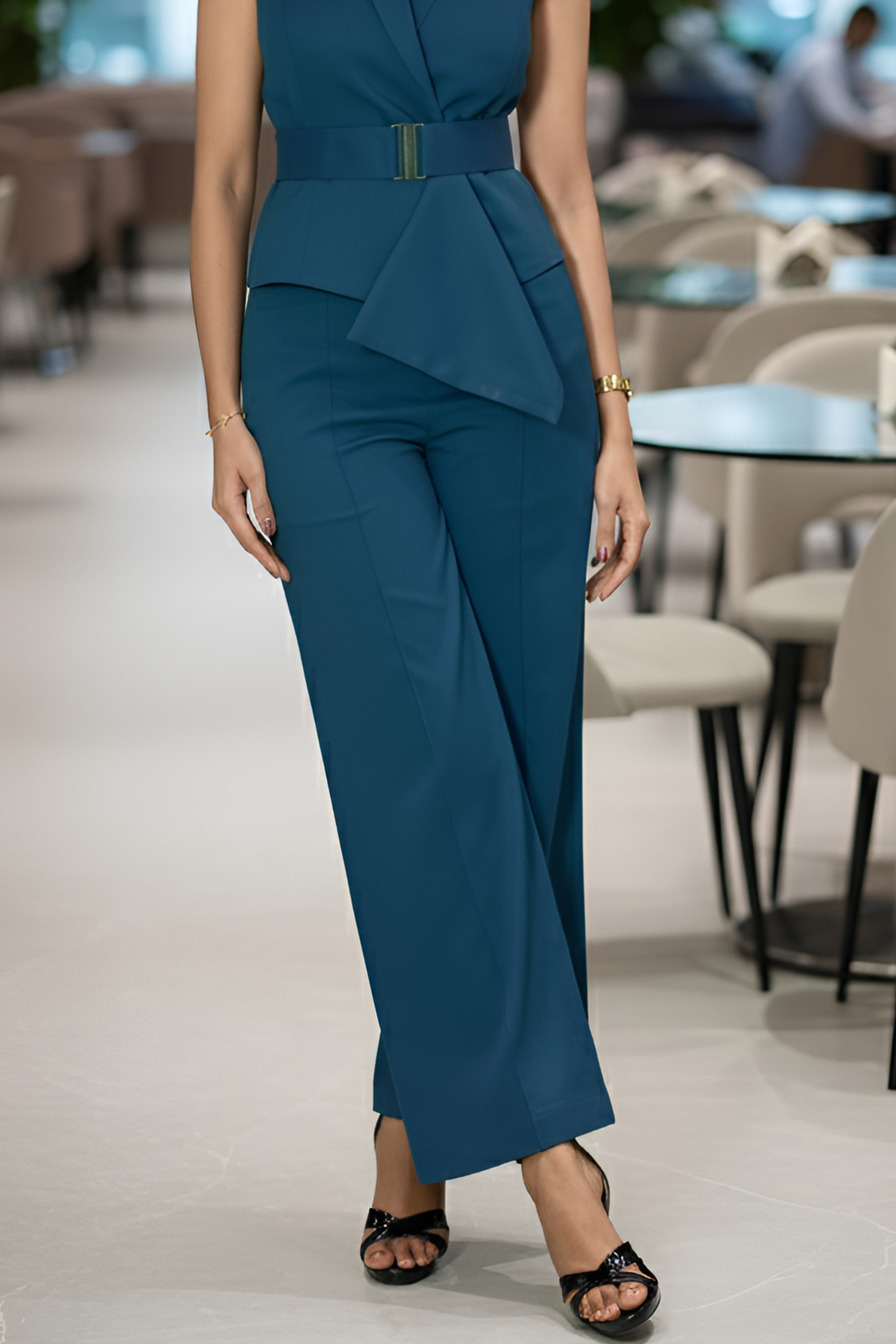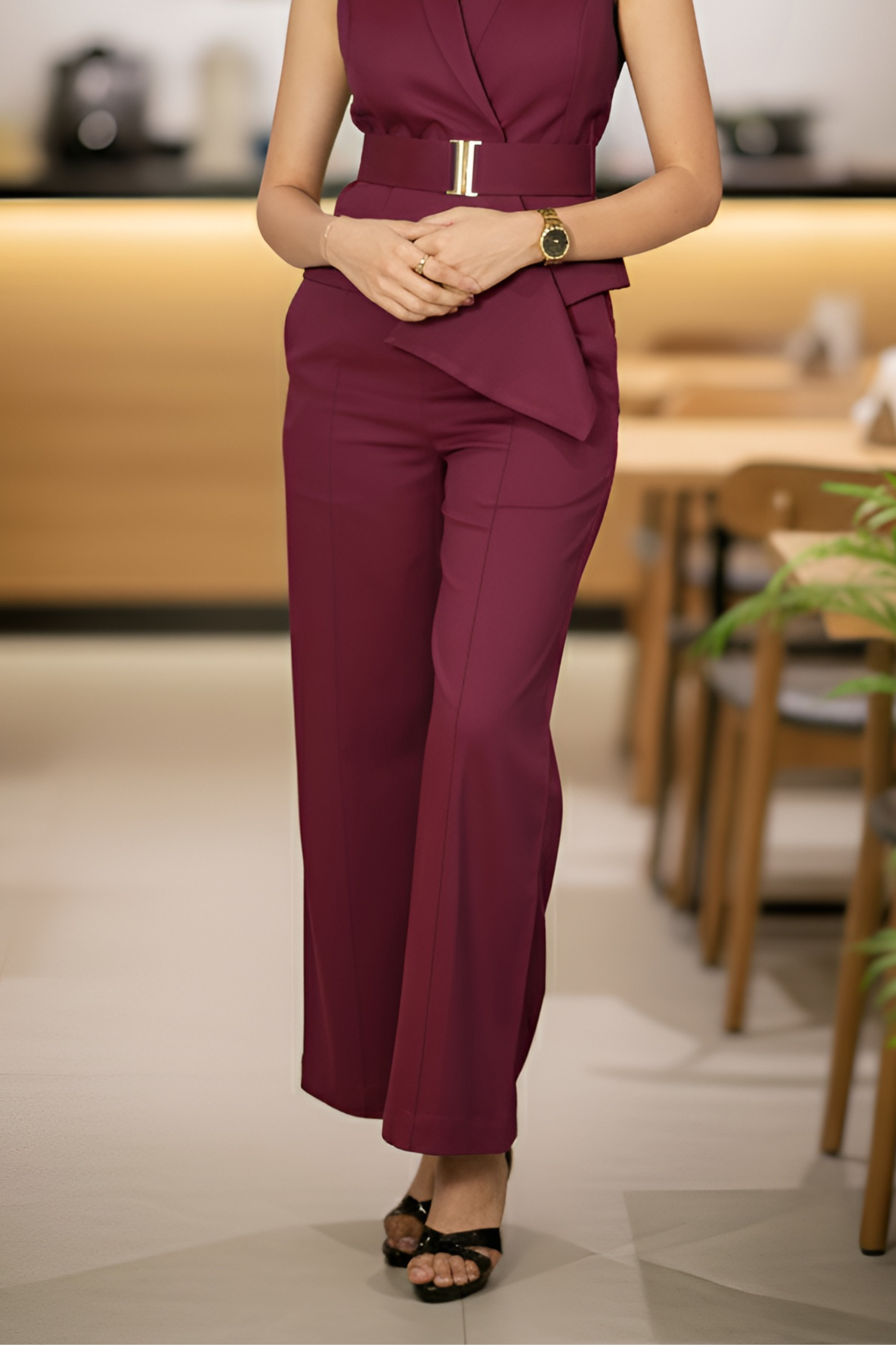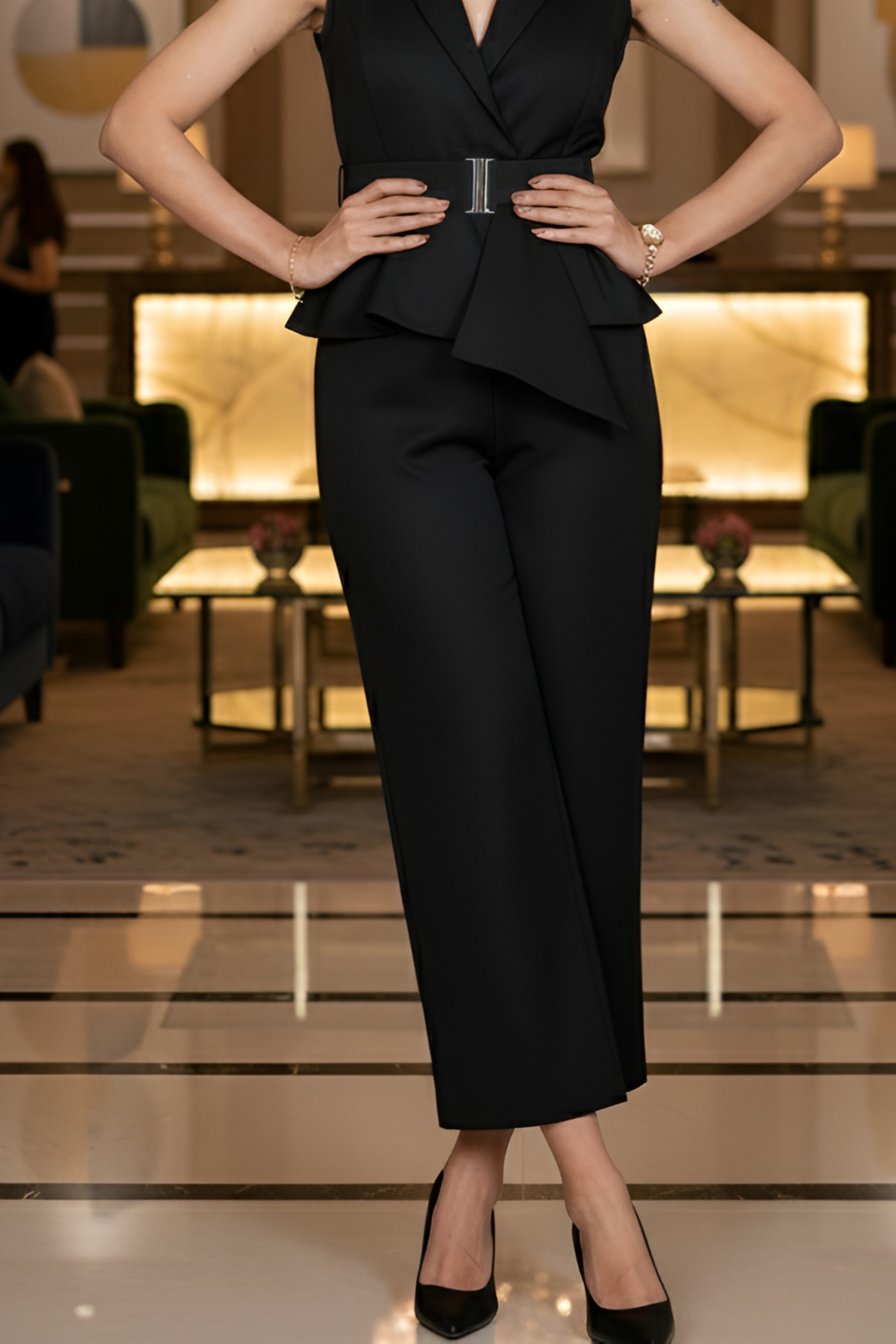 A corset-style bodice with internal boning and soft cups shapes and supports, while a sleek high collar flows into a dramatic V-back secured at the neck. The belt-free waist keeps lines sharp; fluid wide legs finish with a refined side slit for length and easy movement. Made from luxe, comfortable fabric that holds its structure, it’s ready for both corporate functions and personal parties. Style with pointed heels and minimal jewellery by day, then switch to statement earrings and a clutch for evening.