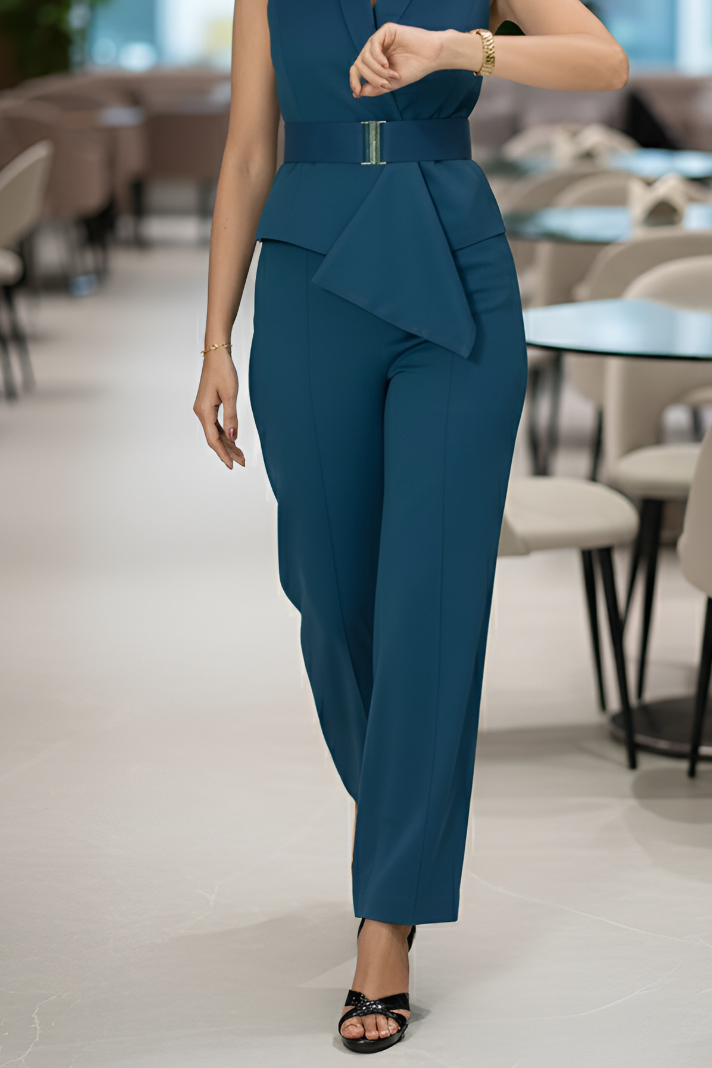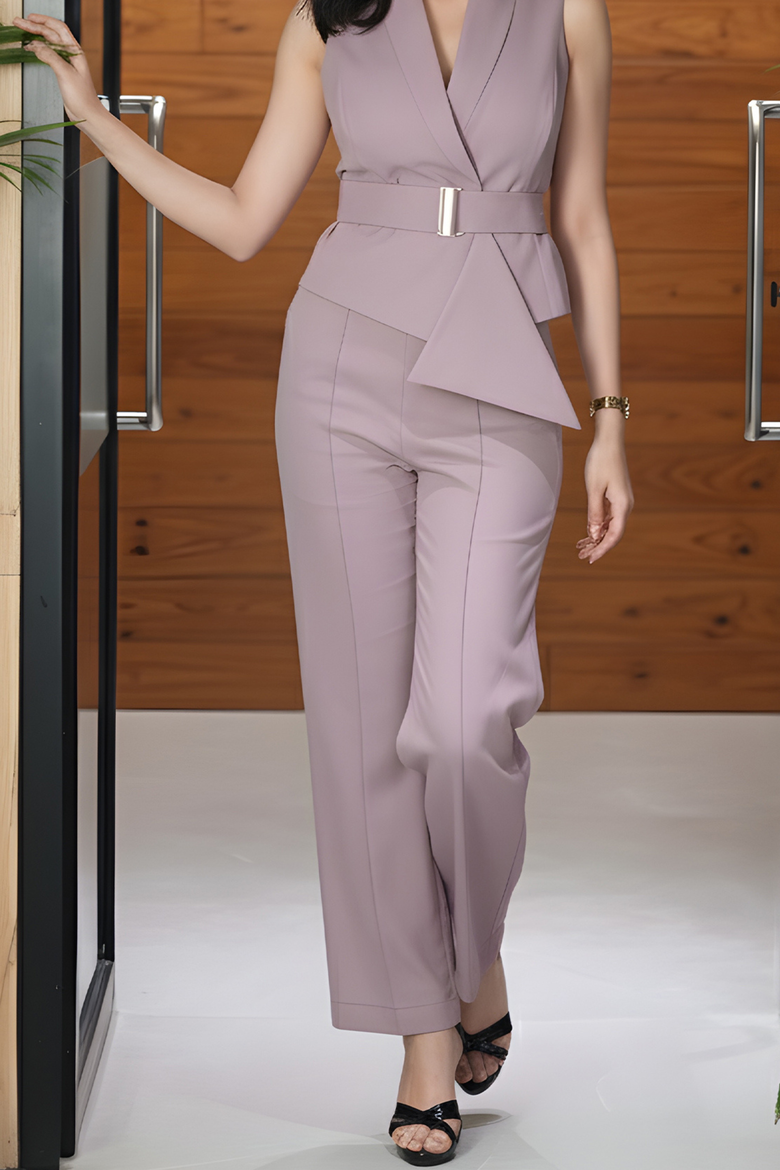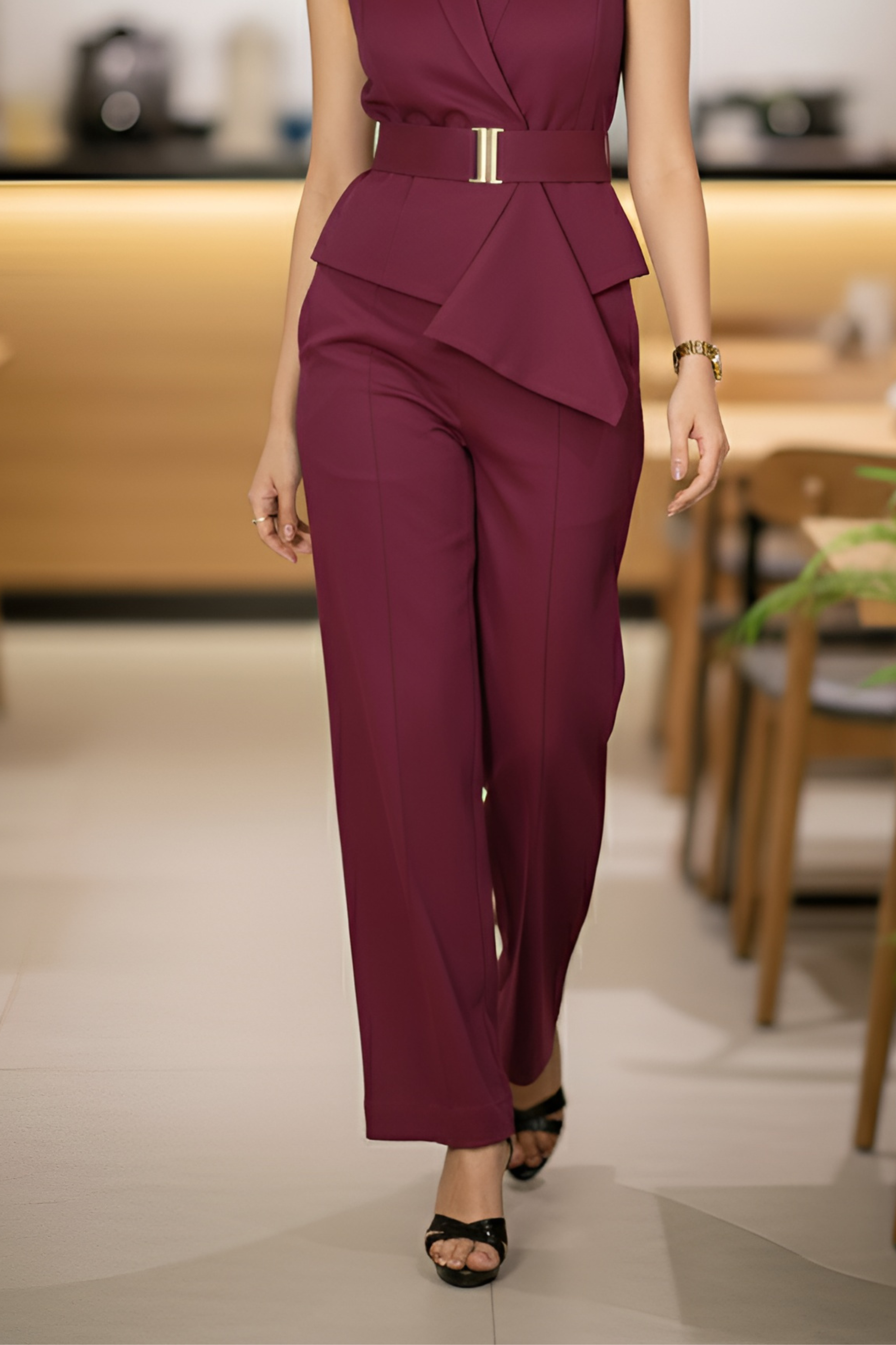 A corset-style bodice with internal boning and soft cups shapes and supports, while a sleek high collar flows into a dramatic V-back secured at the neck. The belt-free waist keeps lines sharp; fluid wide legs finish with a refined side slit for length and easy movement. Made from luxe, comfortable fabric that holds its structure, it’s ready for both corporate functions and personal parties. Style with pointed heels and minimal jewellery by day, then switch to statement earrings and a clutch for evening.